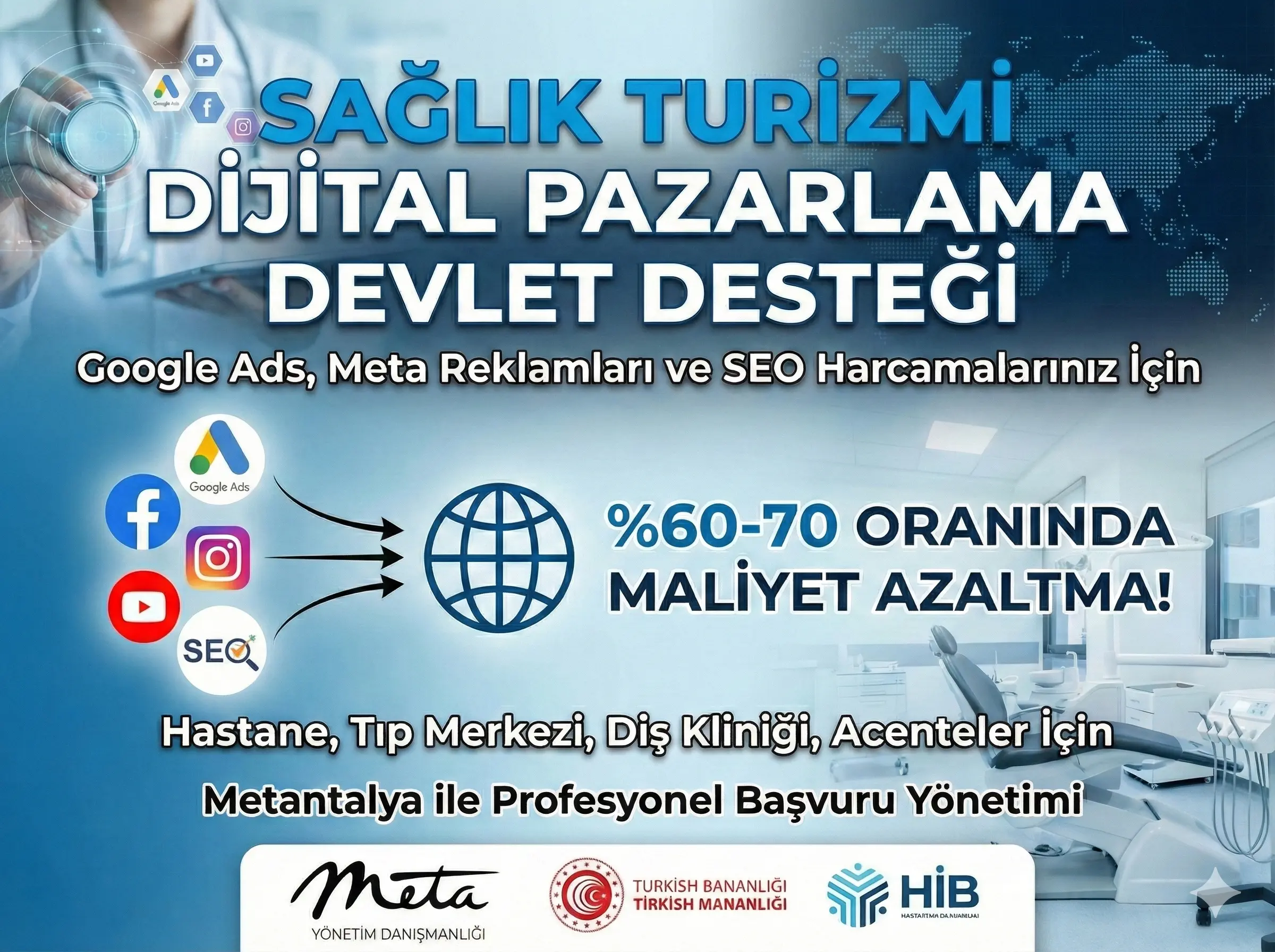 Sağlık turizmi sektöründe faaliyet gösteren işletmelerin dijital pazarlama, reklam ve tanıtım faaliyetleri için sunulan en kapsamlı devlet desteği. Google Ads, Facebook/Instagram reklamları, SEO çalışmaları, influencer marketing ve daha fazlası bu destek kapsamında finanse edilmektedir.
